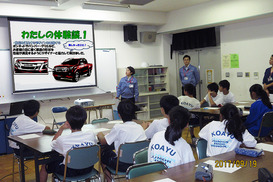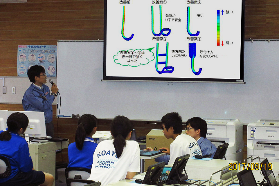 仕事を活かした社会貢献活動として中学生を対象とした出張授業を行いました。9月19日(火)、神奈川県厚木市立小鮎中学校1年生の生徒約60名(1クラス約30名×2)を対象に実施し、設計や構造解析の仕事を紹介したり、仕事でやりがいを感じた体験などの話をしました。設計や構造解析の仕事を実際に体験してもらうため身近なテーマでグループワークを行い、画用紙を使ったタブレットスタンドの設計や、パソコンを使って荷物を掛けるフックを題材に形状や力をかけたときの構造解析をしてもらいました。