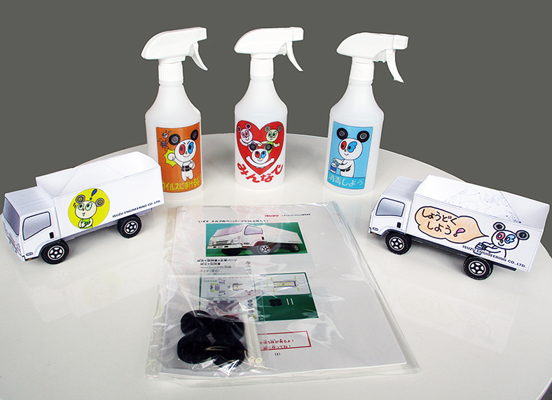 楽しみにしてくれていた子ども達のことを考えると、中止はとても残念でした。そこで、コロナ禍の中でも何か出来る事はないかと、自宅で作れる「ペーパークラフトキット」と、来館した子ども達が楽しく消毒出来る様に、手作りラベルを貼った「消毒ボトル」を作成し、7月28日に長後公民館へ寄贈致しました。